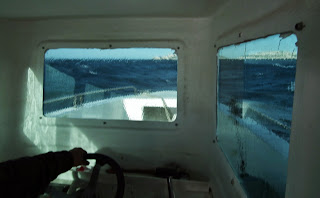 Et un petit épisode de mer au moteur ... Ce matin, 25 noeuds établis, rafales à 56 (100 km/h) à décorner les boeufs et départ devant le bar Le Crystal au Vieux Port du 'bateau de service' du chantier Archimer, espèce de Ferrari de la mer ... et creux de 2 mètres; doucement d'abord, puis plus vite, des retombées de un mètres dans les creux jusqu'à un 'trou de mer' de deux mètres ! Superbe bleu au coccis, Rangement de l'appareil. Ambiance ... Déja fait un retour style rodeo il y a deux mois, mais houle dans le dos, attention aux piqués ! Ah la voile !!!